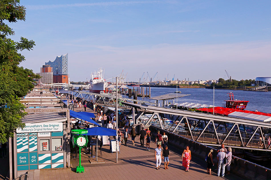 Viele denken hier gleich an Urlaub in Hamburg: Die Landungsbrücken in Hamburg, in der Mitte oben die Elbphilharmonie. Hier kann man gemütlich entlang laufen oder über eine der Brücken zum Anleger runter gehen. Ganz rechts im Bild das Museumsschiff Rickmer Rickmers der Frachtensegler von 1896 und die Cap San Diego das größte betriebsfähige Museumsschiff weltweit. Digi Foto: IMG_7936.JPG Digi Fotos: 0333, FP8 (D24/D6/+#21) Foto: Lars Brüggemann |