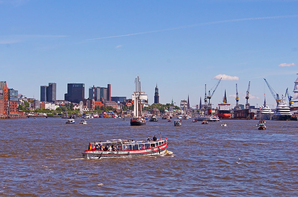 Die Einlaufparade zum Hamburger Hafengeburtstag ist immer etwas ganz Besonderes. Hier der Blick über die Elbe auf Höhe Fischmarkt in Richtung Landungsbrücken während der Einlaufparade. Ganz viele Schiffe fahren auf der Elbe in Richtung Landungsbrücken. Man kann die Einlaufparade vom Land wie am Fischmarkt oder an den Landungsbrücken beobachten. Unten Bild die Barkasse Seute Deern von Barkassen Meyer. Am schönsten ist es aber auf einem Schiff in der Einlaufparade mitzufahren. Buchen kann man sich eine Mitfahrt bei zahlreichen Anbietern, ganz nach Geschmack oder Geldbeutel. Digi Foto: IMG_0926.JPG Digi Fotos: 0380, FP10 (D9/D5/+#25) Foto: Lars Brüggemann |