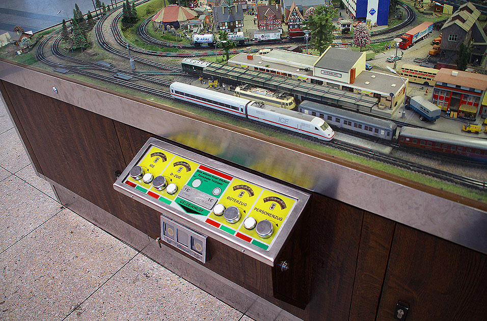 Das Stellwerk der Modellbahn im Leipziger Hauptbahnhof. 1 Euro einwerfen und dann kann man zum Fahrdienstleiter und Lokführer werden. Links der ICE, dann der ICE, der Güterzug und rechts der Personenzug. In D-Mark-Zeiten gab es noch Staffelungen 50 Pfennig, 1 Mark und 2 Mark und je mehr Geld man zahlte desto mehr Züge konnte man fahren lassen. Der ICE selbst ist etwas kurz geraten mit nur einem Triebkopf und einem Mittelwagen. Digi Foto: IMG_3962.JPG Digi Fotos: 0299 (D19/D8/#+18) Foto: Lars Brüggemann |