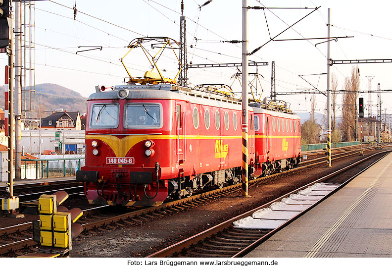 Die RM Lines-Loks 140 045-6 und 140 074-6 im Bahnhof Decin (Bodenbach). Die CD Baureihe 140 (seit 1988) wurde als Baureihe 499 der CSD zwischen den Jahren 1953 und 1958 beschafft. Digitalfoto: IMG_0595.JPG Digi Fotos: 0272 (D2/D4/D2016) Foto: Lars Brüggemann |