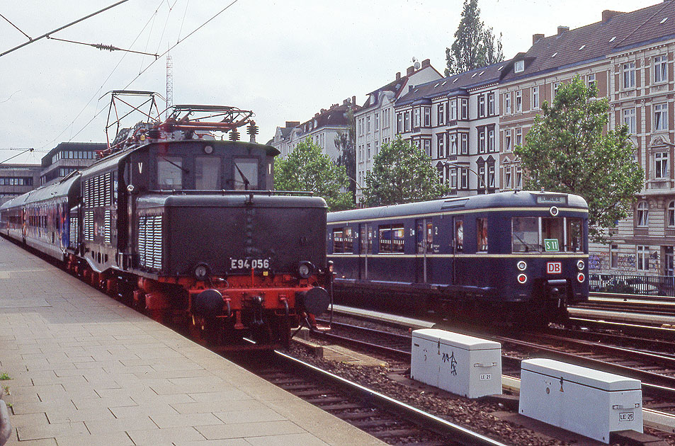 Die E 94 056 war am 3. Juli 1996 mit dem Olympiazug im Bahnhof Hamburg-Altona auf Gleis 5. Rechts im Bild fährt der 471 077, ein Triebwagen der Hamburger S-Bahn in den Tunnelbahnhof Hamburg-Altona. Dia U 29.055 FP10 Foto: Lars Brüggemann Interner Vermerk: Dieses Foto ist noch unter einem anderen Dateinamen online. |