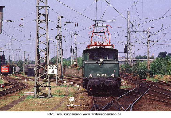 In Hamburg ist eine E 94 schon etwas ganz Besonderes: Am 10. September 2005 kam die 194 158 mit einem Sonderzug nach Hamburg-Altona in Norddeutschland. Links hinter dem Fahrleitungsmast mit der Kilometertafel 292,4 steht der Museumszug den die Lok nach Hamburg-Altona gebracht hat. Rechts im Hintergrund verlässt gerade ein IC den Bahnhof Altona. Ganz rechts im Bild noch die Hallen von der Güterabfertigung Altona, heute befindet sich rechts die Neue Mitte Altona, das Neubauviertel in Altona auf dem Gelände vom ehemaligen Güterbahnhof Altona. Im Einsatz bei der Deutschen Bundesbahn war diese Lokbaureihe in Süddeutschland im Einsatz. Die nördlichsten Anlaufpunkte bis 1988 bei der Bundesbahn waren Bebra und Mainz-Bischofsheim. Nach Hamburg kam sie planmäßig nicht. Hamburger Eisenbahnfreunde die ich fragte konnten sich auch nicht erinnern in Hamburg oder Maschen mal eine 194 im Bundesbahn-Güterzugdienst gesehen zu haben. Zum Einsatzende löste die Baureihe 194 unter Eisenbahnfreunden schon eine Faszination aus, so wie heute in den 2020ern die Baureihe 218. Man fuhr der Baureihe 194 hinterher und fotografierte sie was das Zeug hält. Norddeutsche Eisenbahnfreunde fuhren für die Baureihe 194 schon mal extra nach Süddeutschland wie Bayern, Baden-Württemberg oder wenigstens nach Hessen. Die Lok 194 158 wurde im Januar 1945 von AEG mit der Fabriknummer 5865 an die Deutsche Reichsbahn geliefert, gebaut wurde sie aber 1944. Als Kriegselektrolokomotive (KEL) hatte sie dann aber nicht mehr lange gedient, am 8. Mai 1945 war der Zweite Weltkrieg vorbei. Bis 1988 war die Lok bei der Deutschen Bundesbahn im Einsatz. Dia 10.059-2 Foto CD Zusammenfassung Foto: Lars Brüggemann |