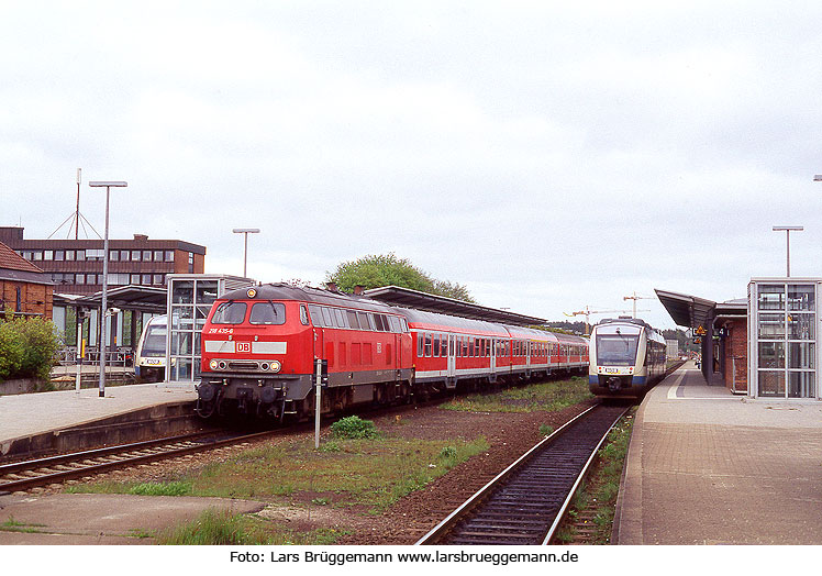 218 435-6 und NOB VT 304 (rechts) in Husum am 11.05.2005 Dia: F15A-DF002 FP3 Foto: Lars Brüggemann Großansicht von dem Foto |