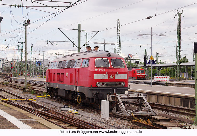 Die 218 813-4 (vormals 218 189) der Deutschen Bahn AG vom Geschäftsbereich Fernverkehr im Stuttgarter Hauptbahnhof auf einem Abstellgleis, im Hintergrund eine E-Lok der Baureihe 120. Digi Foto: IMGP4692.JPG Digi Fotos 0249 (D29/D8/D2014) Foto: Lars Brüggemann larsbrueggemann.de 2.0 auf Facebook |
