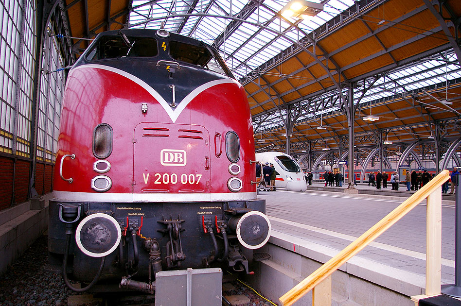 Zur Aufnahme des elektrischen Betriebs zwischen Hamburg und Lübeck am 13. Dezember2008 gab es in Lübeck Hbf auch eine Fahrzeugschau. Dort war die V 200 007 die viele Jahre in Lübeck beheimatet war und von hier auch viele Jahre als Museumslok fuhr zu Gast. Rechts im Bild der Eröffnungszug aus Hamburg, ein ICE. Digi Foto: IMGP4035.JPG Digi Fotos: 0183 Foto: Lars Brüggemann |