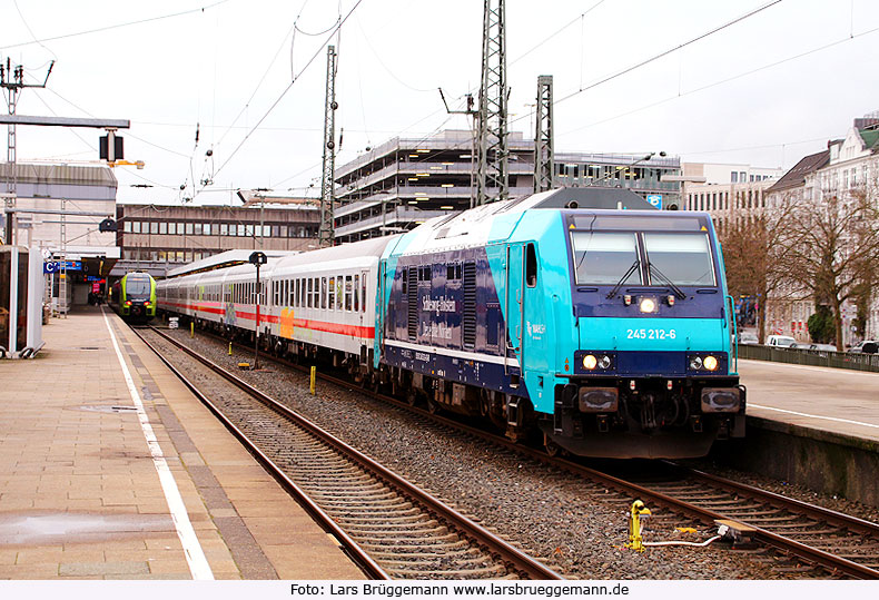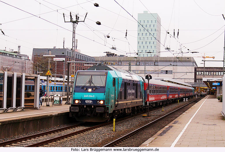 Die DB 245 214-2 mit einem Marschbahn-Ersatzzug gebildet mit roten Silberlingen als Eilzug von Hamburg-Altona nach Westerland auf Sylt. Hier im Bahnhof Hamburg-Altona am 14. Dezember 2016. Die Baureihe 245 ist eine Traxx-Diesellok von Bombardier. Digitalfoto: IMG_1782.JPG Digi Fotos: 0279 Foto: Lars Brüggemann |