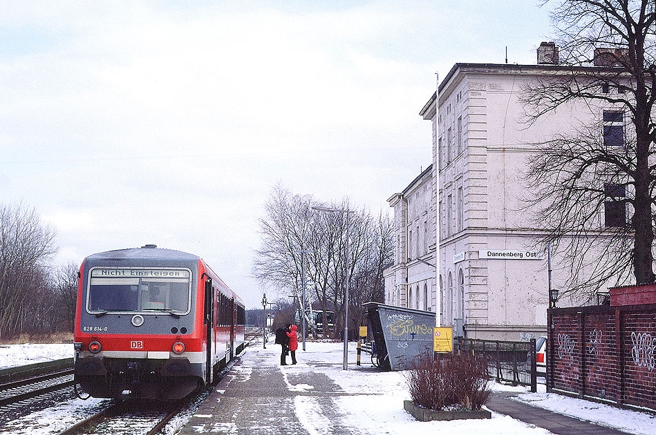 Der Bahnhof Dannenberg-Ost ist heute Endstation für die Züge der Wendlandbahn die mal von Buchholz über Lüneburg nach Wittenberge und Ludwigslust führte. Nach der Teilung Deutschlands 1945 war in Dannenberg Schluss für die Züge in Westdeutschand, Dömitz war Endbahnhof in der Ostzone. Hier steht der 628 614-0 im Februar 2005 vor dem Bahnhofsgebäude von Dannenberg Ost. Dia 8718-1 Foto CD Zusammenfassung Foto: Lars Brüggemann |