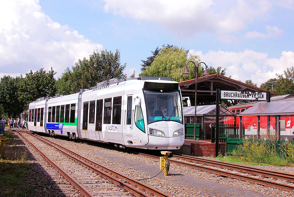 Der RBK 757 in Bruchhausen-Vilsen am 5. August 2006. Hierbei handelt es sich um eine Regiotram der Regionalbahn Kassel (RBK). Diese Straßenbahnen fahren in Kassel und Umgebung als Straßenbahn in Kassel und in die Umgebung als Regionalbahn auf Eisenbahnstrecken. Dia U 11.540-1 Foto CD Zusammenfassung Foto: Lars Brüggemann Diese Seite ist ein Teil einer Online-Foto-Sammlung ähnlich einem Bildband, Sie können sich hier von Seite zu Seite durchklicken. Vielleicht suchen Sie aber Fotos für eine Heimatchronik, ein Fachbuch oder einen Fachartikel? Schreiben Sie mir! Email an Lars Brüggemann: mail@larsbrueggemann.de zurück zur: Startseite |