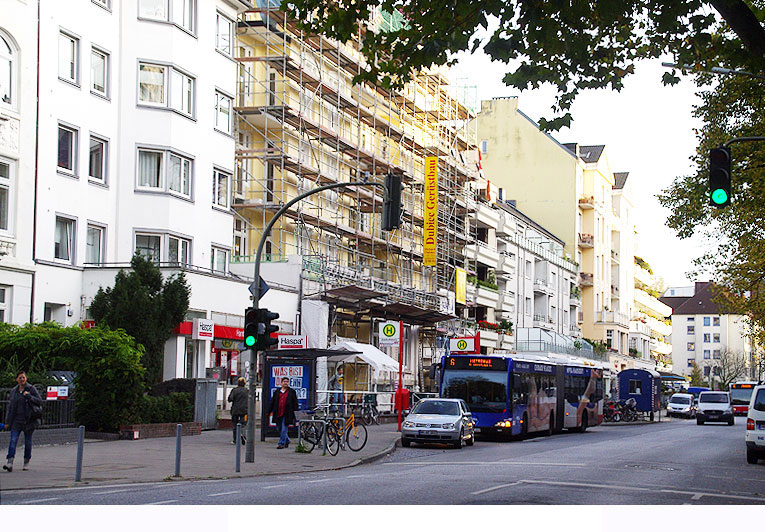Am 27. Oktober 2014 hält ein Hochbahn-Bus an der Haltestelle Mühlenkamp / Hofweg. Im Oktober 2014 macht man sich hier große Sorgen um Parkplätze und engagierte sich gegen die Busbeschleunigung. Digitalfoto: IMGP8839.JPG Digi Fotos: 0253 Foto: Lars Brüggemann |