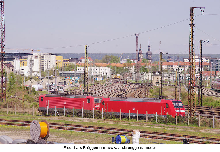 Die 146 014 im Gleisvorfeld vom Dresdener Hauptbahnhof, rechts daneben die 182 023. Digi Foto: IMGP2749.JPG Digi Fotos: 0262 (D13/D7/D2015) Foto: Lars Brüggemann |