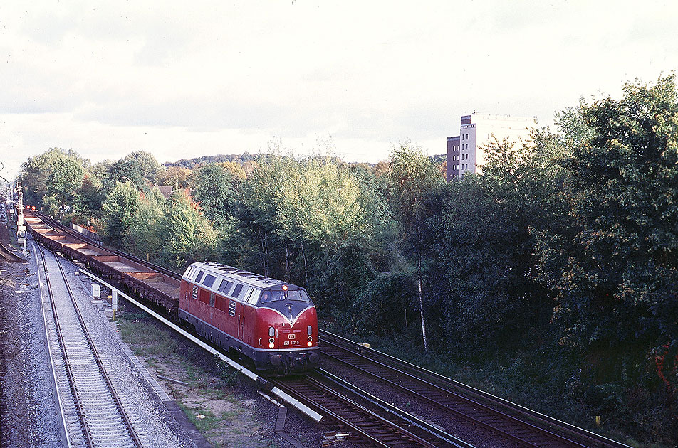Die 221 121-7 der Deutschen Bundesbahn am 14. Juli 1986 in Duisburg. Im Ruhrgebiet war das letzte Einsatzgebiet der Baureihe 221 zum Aufnahmezeitpunkt war die 221 121-7 im Bw Oberhausen-Osterfeld beheimatet. Die Lok wurde als V200 121 im Jahr 1964 von der Deutschen Bundesbahn in Betrieb genommen und mit der Fabriknummer 19241 von Krauss Maffei geliefert. Dia 1554 FP7 Foto: Lars Brüggemann |