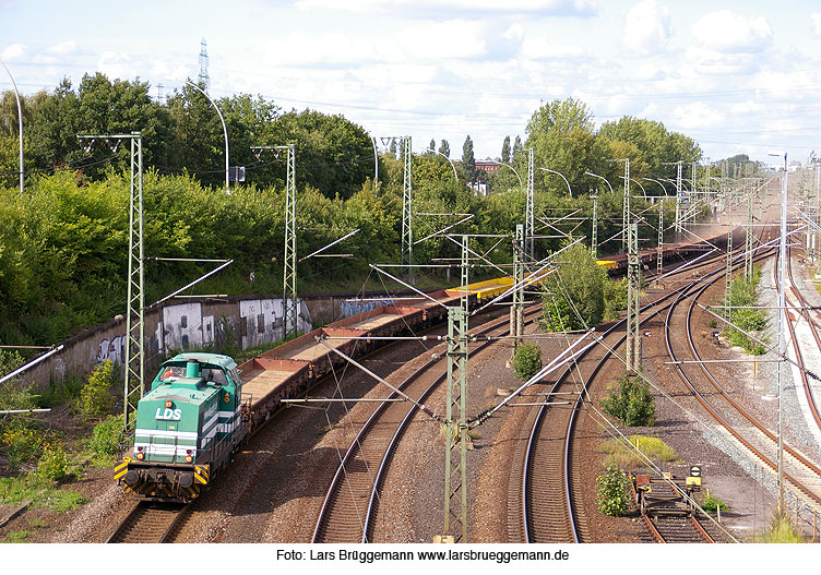 Eine V 100 Ost von LDS fuhr am 19. Mai 2009 mit einem Bauzug durch den S-Bahn-Bahnhof (Haltepunkt) Hamburg Rübenkamp. Digitalfoto: IMGP0051.JPG Digi Fotos: 0188 Foto: Lars Brüggemann Dieses Foto finden Sie auch hier: Bahnhof Hamburg Rübenkamp |
