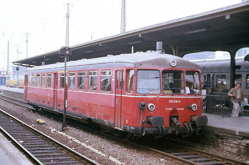 Mit Elektromobilität ohne Oberleitung auf der Schiene: Ein Bundesbahn-Akkutriebwagen 515 636-5 in Dortmund Hbf aufgenommen am 14. Juli 1986. Akkutriebwagen haben bei der Eisenbahn eine lange Tradition nur hatten sie sich nie erfolgreich durchgesetzt auch wenn sie sich schon bewährt hatten. Dia 1558 FP3 Foto: Lars Brüggemann Interner Vermerk: Dieses Foto ist noch unter einem anderen Dateinamen online. |