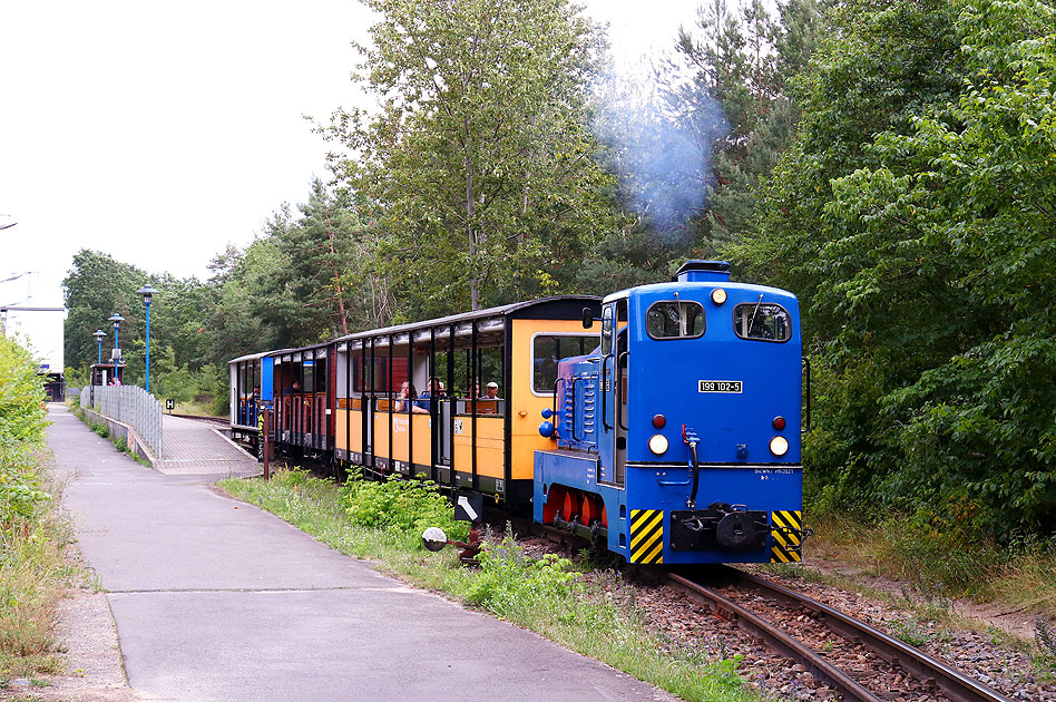 Die Lok Gunther mit der Nummer 199 102-5 der Berliner Parkeisenbahn verlässt mit einem Personenzug den Bahnhof Wuhlheide. Die Lok vom Typ V10 C wurde 1971 vom VEB Kombinat Luft- und Kältetechnik Betrieb Karl Marx Babelsberg mit der Werk-Nummer 250517 an die Berliner Pioniereisenbahn geliefert. Digi Foto: IMG_8097.JPG Digi Fotos: 0346 (D22/D7/#22) Foto: Lars Brüggemann Interner Vermerk: Dieses Foto ist noch unter einem anderen Dateinamen online |