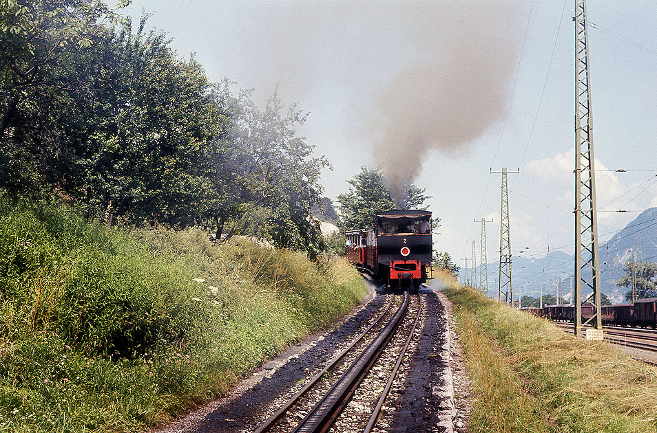 Das hier war in den 1990er Jahren. Die Lok 2 verlässt hier den Bahnhof Jenbach mit einem Personenzug zum Achensee. Jenbach ist der Startbahnhof der Achenseebahn nach Seespitz in Tirol. Wegen der Steigung schiebt die Dampflok die Personenwagen den Berg bis Eben hinauf. In Eben endet die Zahnradstrecke, hier setzt die Lok nach vorne um und zieht den Zug von Eben zum Achensee. Dia U 29.042 FP10 Foto: Brüggemann |