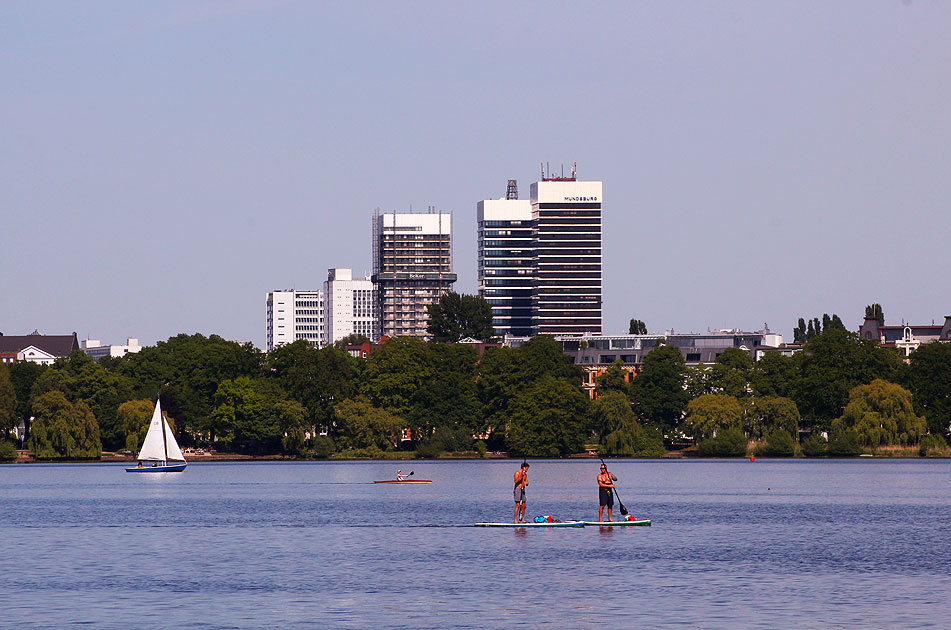 Der Blick von der Hamburger Außenalster auf das "ewcht" Alsterufer, also das westliche Alsterufer. Der Begriff linkes Alsterufer kommt von dem Schachturnier linkes gegen rechtes Alsterufer wobei es um den Alsterlauf geht. Links oben im Bild das 118 Meter hohe Radisson Blu Hotel. Das Radisson Blu Hotel ist eines der bekannten Hotels in Hamburg, direkt am Dammtorbahnhof und am CCH (Congress Center Hamburg). Rechts neben Hotel der Hamburger Fernsehturm. Die Hamburger nennen ihn eigentlich nur Fernsehturm, Telemichel wird er auch genannt, doch sein hochoffizieller Name ist: Heinrich-Hertz-Turm. Gebaut wurde er eigentlich für die Deutsche Bundespost. Der 276,5 Meter hohe Turm wurde von 1966 bis 1968 gebaut. Digi Foto: IMG_3210.JPG Digi Fotos: 0378, FP10 (D31/D3/alster25) Foto: Lars Brüggemann |