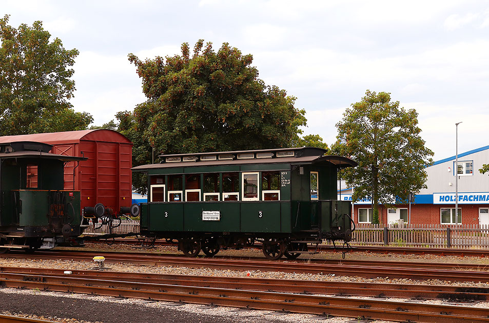 Der wohl schönste Bahnhof der Museumsbahn von Bruchhausen-Vilsen nach Asendorf ist der Bahnhof Vilsen Ort. Hier im Bahnhof Vilsen Ort rangiert die Lok Hermann mit dem Wagen 137. Der Wagen 137 ist sowohl ein Personen- als auch ein Güterwagen. Für die Kombination von Personen- und Güterwagen gibt es auch ein Fachwort. Bei dem Fachwort muss man schon genau hinhören wenn einem der Begriff nicht geläufig ist. Der Wagen 137 ist nämlich ein Fakultativwagen und ist beim DEV bei den Güterwagen eingeordnet. Der Wagen wurde 1906 von der Firma Beuchelt & Co in Schlesien (heute in Polen) an die Franzburger Kreisbahn geliefert. 1973 hatte der DEV den Wagen übernommen und er ging nach Westberlin, nach Berlin-Spandau. Aber schon 1976 wurde der Wagen nach Bruchausen-Vilsen transportiert. Zwischen 1987 und 1990 erhielt der Wagen eine Totalsanierung und wurde weitestgehend in seinen Ursprungszustand zurückversetzt. Eine Besonderheit an dem Wagen ist auch seine Görlitzer Gewichtshebelbremse. Für Modellbahner gibt bzw. gab es diesen Wagen auch als Modell von LGB (Lehmann Garten Bahn). Digi Foto: IMG_6492.JPG Digi Fotos: 0347 (D7/D8/#22) Foto: Lars Brüggemann |