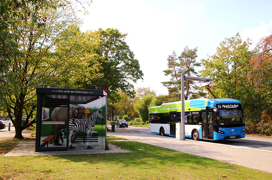 Mit Elektromobilität durch Münster: Der Elektrobus 1862 der Stadtwerke Münster an der Endhaltestelle Zoo in Münster. Der Bus steht hier am Lademast und wird mit Strom nachgeladen. Sehr schön im Bild zu sehen: Links im Bild das Trafohäuschen für den Lademast für den Elektrobus. Seit 2015 setzen die Stadtwerke Münster auf der Buslinie 14 zwischen Maikottenweg über Hauptbahnhof und Domplatz zum Zoo Elektrobusse ein. An den beiden Endhaltestellen stehen Schnellladestationen zum nachladen der Busse. Dieser Bus ist vom Typ Citea SLF-120 Electric und kommt vom niederländischen Hersteller VDL. Der 12 Meter lange Elektrobus ist mit einem 160 kW starken Siemens-Elektromotor ausgestattet. Digitalfoto: IMG_5151.JPG Digi Fotos: 0311 (D27/ladung8/#19) Foto: Lars Brüggemann |