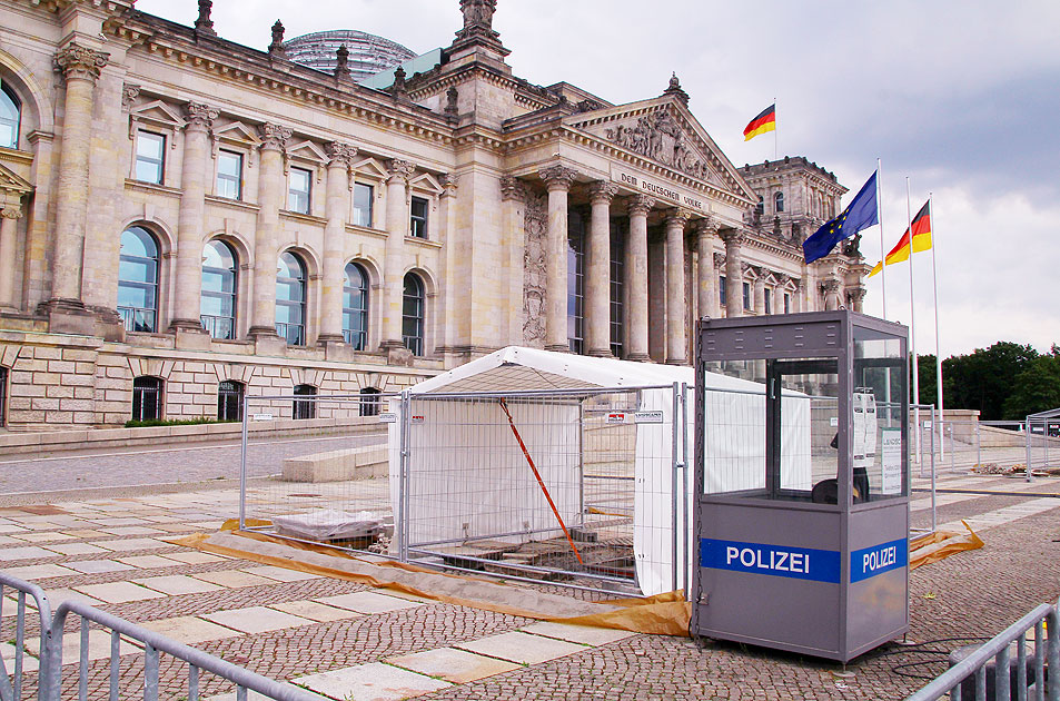Der Reichstag in Berlin, rechts im Bild ein obligatorisches Polizeifahrzeug. Digi Foto: IMG_5648.JPG Digi Fotos: 0297 (D21/D9/berlin20) Foto: Lars Brüggemann |