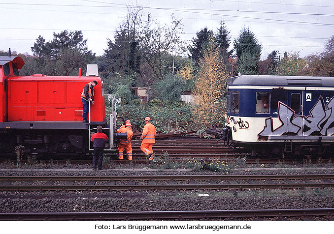 Der 471 040 gezogen von der 291 034 hier im Bahnhof Hamburg-Barmbek, aufgenommen am 26. Oktober 2000. Der Cannstätter 471 ist auf seiner letzten Fahrt zur Verschrottung nach Lübeck. Dia U 24.549 FP5 Foto: Lars Brüggemann |