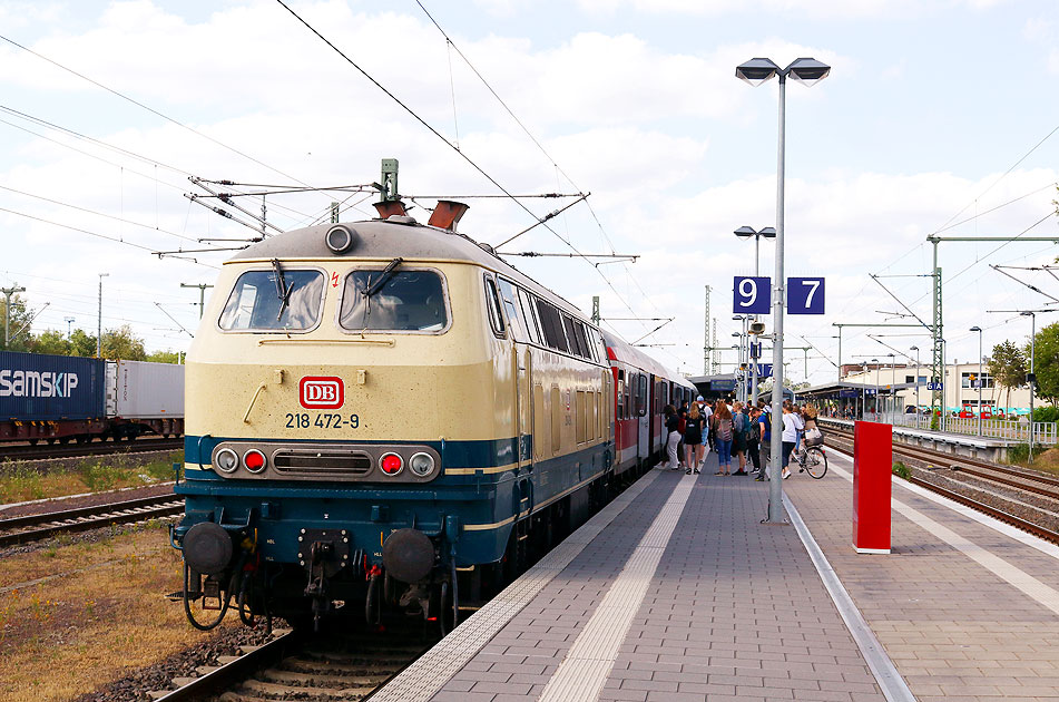 Ein Eilzug nach Goslar in Magdeburg Hbf auf Gleis 9: Es führt die 218 472-9, am Haken hat die Diesellok von Power Rail zwei Silberlinge und ein langer Halberstädter als Steuerwagen. Das 9-Euro-Ticket machte es möglich das man diesen Verstärkungszug statt mit einem Abellio-Lint-Triebwagen fährt. Die 218 472-9 wurde 1977 von Krauss-Maffei mit der Fabriknummer 19787 an die Deutsche Bundesbahn geliefert. Von 1977 bis 2015 war die Lok beim Bw Kempten beheimatet. 2016 wurde sie an Railsystems RP verkauft. RP verkaufte die Lok dann weiter an Power Rail mit Sitz in Magdeburg. Nun trägt die Lok wieder ihre anfängliche Bundesbahn-Lackierung mit DB-Keks, also eine Museumslok mit Museumswagen im Planeinsatz. Digi Foto: IMG_3738.JPG Digi Fotos: 0345 (D16/D6/#+22) Foto: Lars Brüggemann Interner Vermerk: Dieses Foto ist noch unter einem anderen Dateinamen online. |