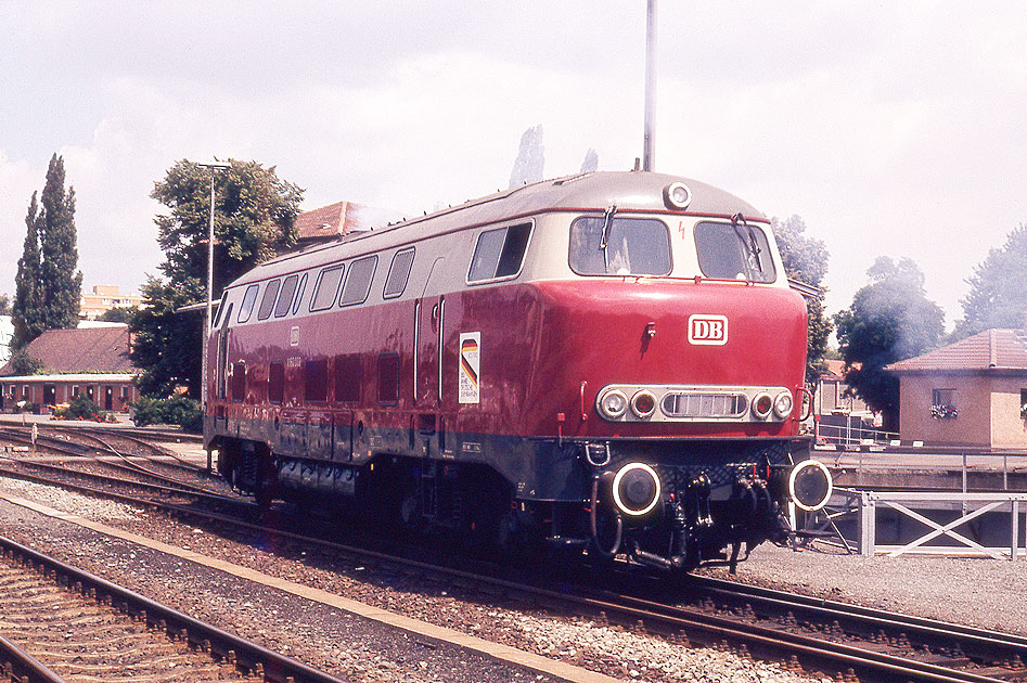 Im Sommer 1985 feierte die Deutsche Bundesbahn 150 Jahre Deutsche Eisenbahnen. Hier ist die V 160 003 im Bahnhof Bayreuth Hbf am Bahnbetriebswerk. Die Lok war hier vor Sonderzügen im Einsatz. Rechts unten an der Lok der in diesem Jahr für jede Lok obligatorische Aufkleber: 150 Jahre Deutsche Eisenbahnen. Dia: 869 (ausgerahmt) FP8 Foto: Brüggemann Interner Vermerk: Dieses Foto ist noch unter einem anderen Dateinamen online. |