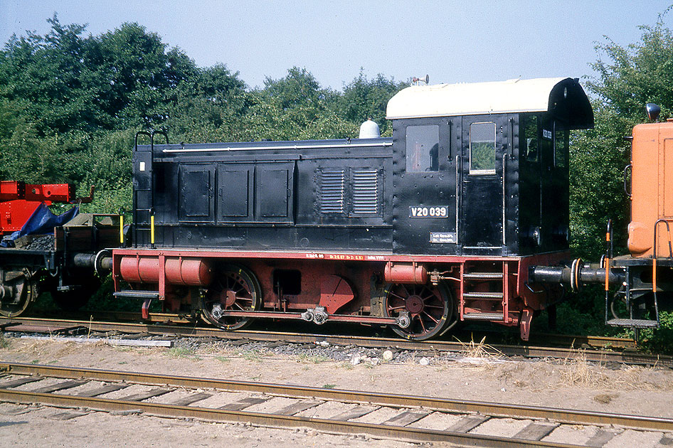 Im August 1995 steht die VVM V 20 039 im Bahnhof Schönberger Strand. Die V 20 039 wurde 1943 von Deutz mit der Fabriknummer 39659 an das Reichsluftministerium geliefert. 1947 ging die Lok an die Deutsche Reichsbahn und 1949 an die Deutsche Bundesbahn. Am 1. Januar 1968 wurde die Lok zur 270 039-1. Im Jahr 1979 wurde die Lok ausgemustert und ging über privat an den VVM (Verein Verkehrsamateure und Museumsbahn) zum Schönberger Strand. Dia U 29.011 FP8 Foto: Brüggemann |