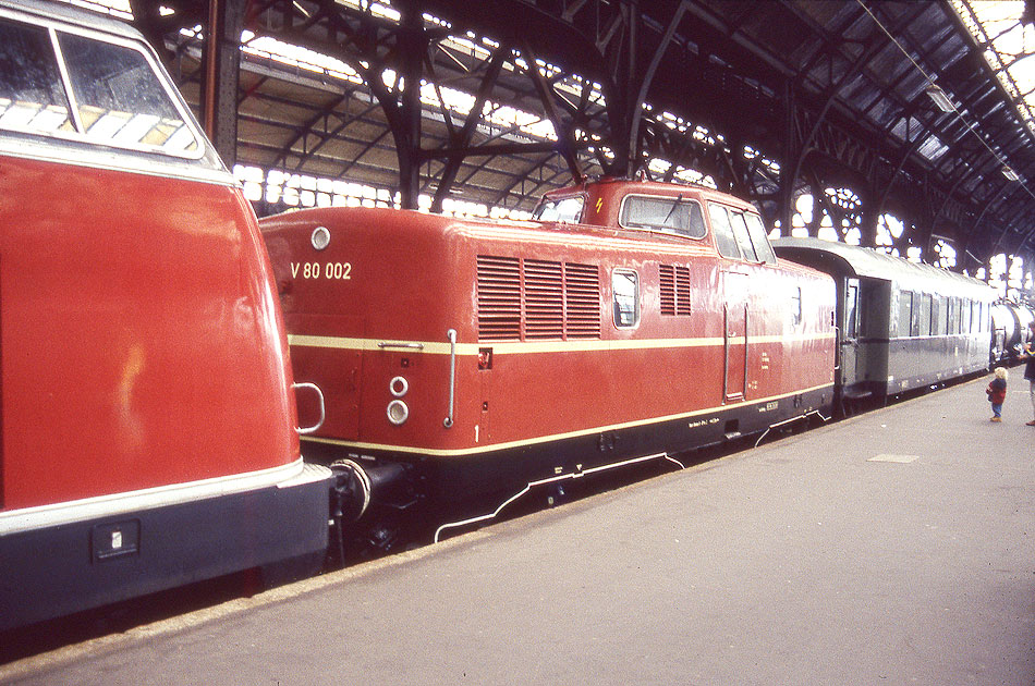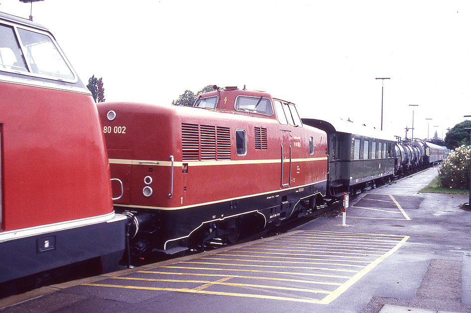 Die Museumslok V 80 002 hinter der Museumslok V 200 002 am 6. September 2000 in Lübeck Hbf. Die Baureihe V 80 war in den Jahren 1951/1952 die erste neuentwickelte Diesellok für den Streckendienst der damals noch jungen Deutschen Bundesbahn. Von dieser Lokbaureihe wurden nur zehn Stück gebaut, die Loks V 80 001 bis 005 von Krauss-Maffei und die Loks V 80 006 bis 010 von MaK. Dia U 26.095-1 FP8 Foto: Lars Brüggemann Diese Seite ist ein Teil einer Online-Foto-Sammlung ähnlich einem Bildband, Sie können sich hier von Baureihe zu Baureihe durchklicken. Vielleicht suchen Sie aber Fotos für eine Heimatchronik, ein Fachbuch oder einen Fachartikel? Schreiben Sie mir! Email an Lars Brüggemann: mail@larsbrueggemann.de Dieses Angebot richtet sich nicht an bildersammelnde Eisenbahnfreunde zur kostenlosen Zusendung (für "private Zwecke"). zurück zur: Startseite |