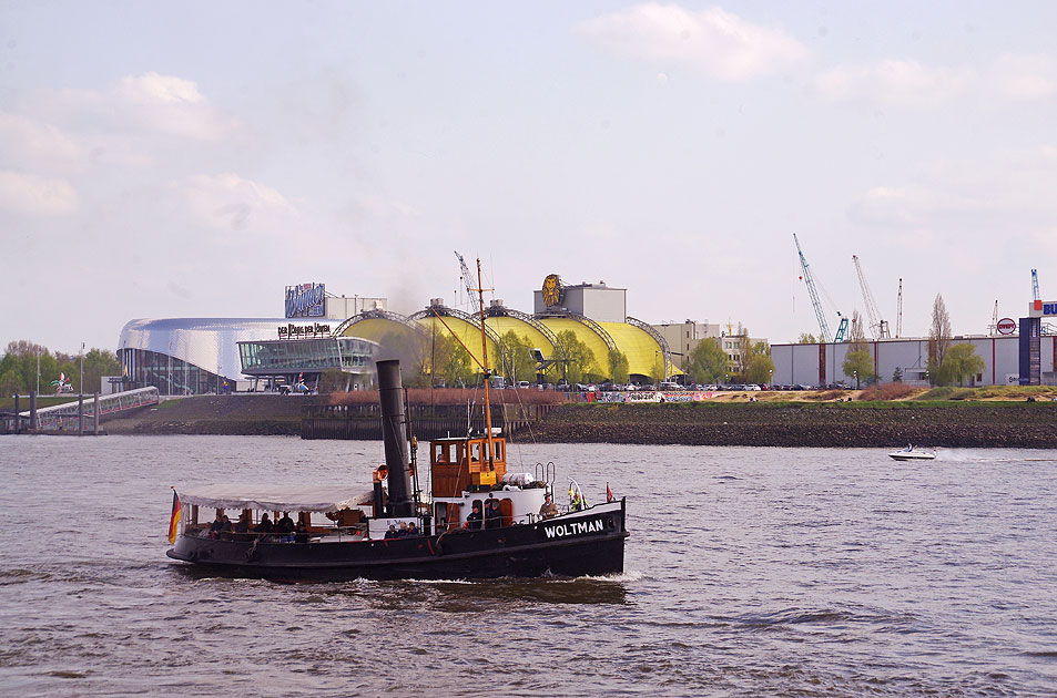 Mit Wasser, Kohle und Dampf: Der historische Dampfschlepper Woltmann fährt hier an den St. Pauli Landungsbrücken in Hamburg auf der Elbe vorbei. Im Hintergrund das Blohm + Voss Dock Elbe 17. Der Schleppdampfer Woltmann wurde 1904 auf der Schiffswerft der Gebrüder Sachsenberg in Roßlau an der Elbe gebaut. Digi Foto: IMGP9023.JPG Digi Fotos: 0272, FP5 (D1/D5/#+16) Foto: Lars Brüggemann |
